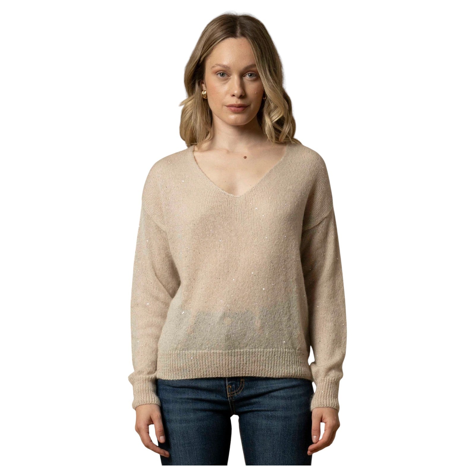 Questa maglia si distingue per l’ampio scollo a V e il delicato gioco di trasparenze del tessuto, impreziosito da piccoli punti luce che regalano un accento di scintillante glam al capo. Il modello presenta bordi a costine e taglio classico.