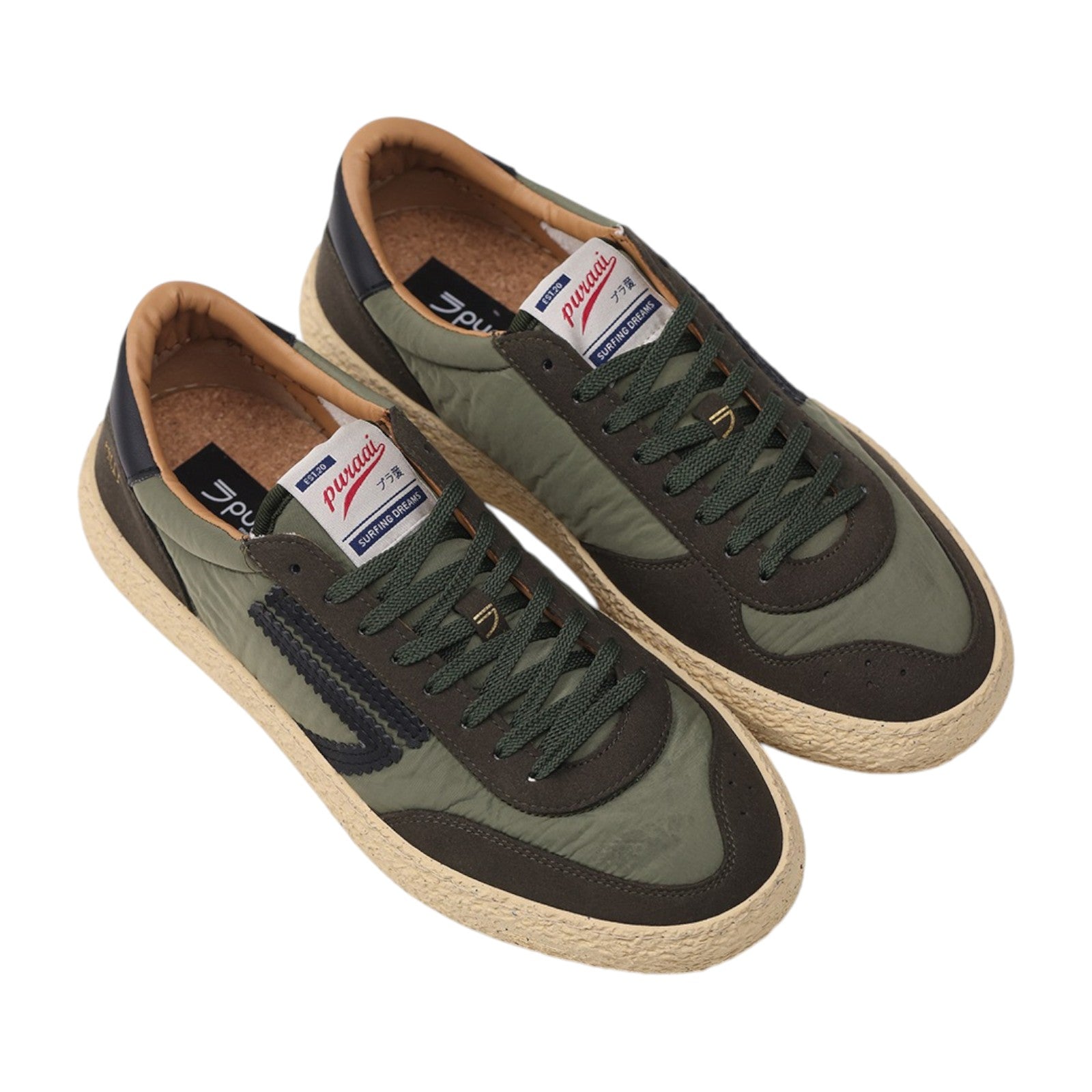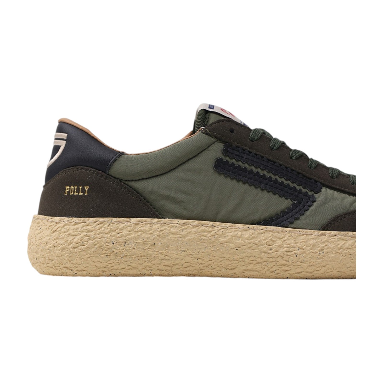 Nylon verde, microsuede verde, logo e dettagli neri.Suola vaniglia e lacci neri.